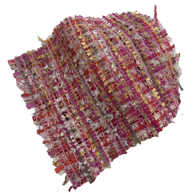 Tato látka, označená jako artikl 21003, je tvídová textilie složená z 67 % polyesteru a 33 % akrylu. S hmotností na jednotku plochy 385 g/m2 představuje středně těžkou konstrukci. Tkanina obsahuje červené a růžové flitry kombinované s kovovou přízí, integrované během procesu tkaní, aby vytvořily rozptýlený reflexní povrch. Polyesterový základ poskytuje strukturální stabilitu, zatímco akrylová složka přispívá k nadýchání a struktuře látky. Výsledkem této kombinace je materiál s různou odrazivostí světla a povrchovými rozměry. Tyto technické vlastnosti činí tento tvíd použitelný pro dámské oděvy, kde jsou vyžadovány dekorativní prvky a strukturální integrita.