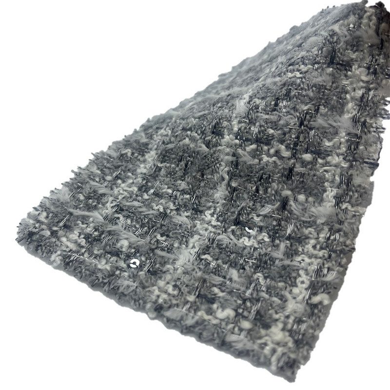 Tato látka, označená jako artikl 23503, je tvídová textilie složená ze 49 % akrylu, 40 % polyesteru, 7 % vlny a 4 % nylonu. S hmotností na jednotku plochy 335 gsm představuje lehkou, ale strukturovanou konstrukci. Povrch se vyznačuje jemným šedým kostkovaným vzorem, dosaženým procesem embosování, který na látce vytváří jemnou vyvýšenou texturu. Tato technika zvyšuje vizuální hloubku plédu bez změny tkané základny. Vícevláknová směs kombinuje stabilitu polyesteru, odolnost akrylu, přirozený dotyk vlny a odolnost nylonu. Díky těmto vlastnostem je látka vhodná pro dámské oděvy, kde je vyžadováno podrobné vzorování a hmatový zájem.