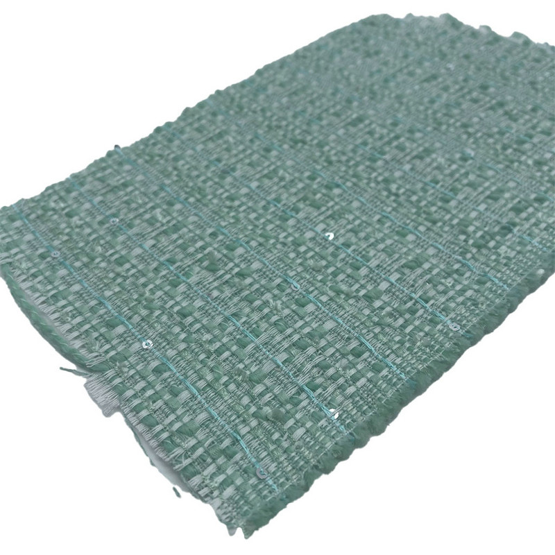 Tato látka, označená jako artikl 22102, je žakárová tvídová textilie složená z 90 % polyesteru a 10 % vlny. S hmotností na jednotku plochy 320 gsm představuje lehkou konstrukci vhodnou pro šaty. Světle zelená základna má reliéfní žakárový vzor, kde jsou během procesu tkaní integrovány flitry, aby se vytvořily lokalizované reflexní oblasti. Vysoký obsah polyesteru zajišťuje tvarovou stálost a tvarovou stálost, zatímco vlněná složka přispívá k hmatovým vlastnostem látky. Tato kombinace vede k materiálu s proměnlivou strukturou povrchu a strukturní konzistencí. Tyto technické vlastnosti činí tento žakárový tvíd použitelný pro šaty, kde je vyžadován dekorativní povrch a struktura oděvu.