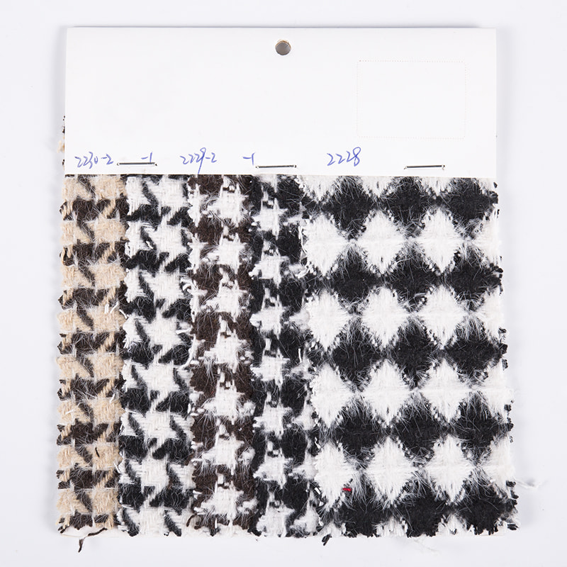 Charakteristickým rysem tkaniny Long Hair Diamond Houndstooth Tweed Fabric 2230/2229/2228 je jedinečná technologie zpracování dlouhých vlasů, která kombinuje klasický diamantový tvar a vzor houndstooth, aby vytvořila patchwork a vrstvený vizuální efekt. Tento inovativní design nejenže dává látce vysoký stupeň uznání, ale také ji dělá vyniknout mezi mnoha podobnými produkty. Z hlediska materiálového složení je tkanina vyrobena ze 100% chemických vlákenných surovin, které zajišťují vynikající fyzikální vlastnosti a chemickou stabilitu. Materiál z chemických vláken s dobrou odolností proti opotřebení, mačkavostí a snadnou údržbou umožňuje této látce zachovat si svůj ostrý tvar a jasnou barvu při dlouhodobém používání. Zároveň je přísně kontrolována hygroskopicita, prodyšnost a další ukazatele chemických vláken, aby byl zajištěn komfortní zážitek při nošení. Řemeslné zpracování dlouhého vlněného diamantového tvídu houndstooth je také chvályhodné. Použití pokročilé textilní technologie a vybavení umožňuje tkanině zachovat hrubou strukturu a zároveň mít jemný omak. Osnovní a útkové příze jsou pevně a rovnoměrně propleteny, což zajišťuje pevnost a stabilitu tkaniny. Pokud jde o oblasti použití, je tvídový tvíd s dlouhými vlasy diamantový houndstooth široce používán v módě haute couture, elegantních oblecích a různých dekorativních látkách díky svému jedinečnému designu a vynikajícímu výkonu.