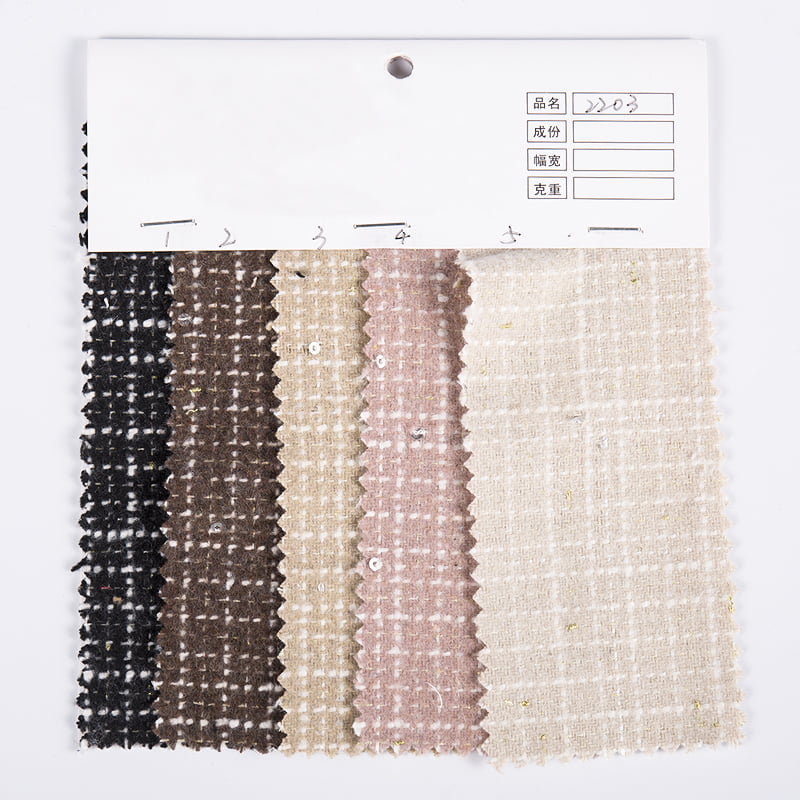 Sequins Check Plaid Tweed Fabric 2203 je látkový výrobek vyrobený z vysoce kvalitního 100% chemického vlákna. Díky pokročilé textilní technologii tato tkanina dokonale kombinuje trvanlivost, odolnost proti mačkavosti a vlastnosti chemického vlákna se snadnou údržbou, což zajišťuje, že si látka může zachovat svůj původní tvar a texturu po dlouhodobém používání a častém praní. Hlavní rys látky spočívá v jedinečném károvaném designu s flitry. Flitrové prvky jsou rovnoměrně rozmístěny na povrchu látky pomocí jemného vkládání, což nejen zvýrazňuje vizuální vrstvení látky, ale také pod světlem vykazuje jemný a nenápadný efekt lesku a dodává jedinečný zvýraznění. oblečení. Kostkovaný vzor přebírá klasické barevné sladění a rozložení, které nejen zachovává retro kouzlo tvídové látky, ale také zahrnuje jednoduchost a atmosféru moderního designu, takže látka může ukázat elegantní a stylový vzhled při různých příležitostech. Pokud jde o texturu, flitrovaná károvaná tvídová látka 2203 s procesem tvídového tkaní dodává látce bohatý trojrozměrný smysl a jemný dotek. Výběr chemických vláken činí látku měkkou a pohodlnou a zároveň má dobrou prodyšnost a odolnost proti opotřebení, což zajišťuje, že nositel může zažít pohodlí a pohodlí a zároveň si užívat módní krásu. Flitrovaná kostkovaná tvídová tkanina 2203 má také extrémně vysokou plasticitu a použitelnost. Ať už se používá pro špičkovou přizpůsobenou módu nebo doplňky pro každodenní nošení, látka dokáže dokonale integrovat různé styly designu a požadavky na krejčovství a ukazuje různá módní kouzla.